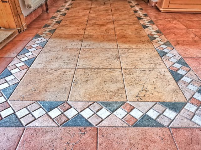 Podlahy dřevěné a dlažba. Zatemňovací závěsy v obývacím pokoji.