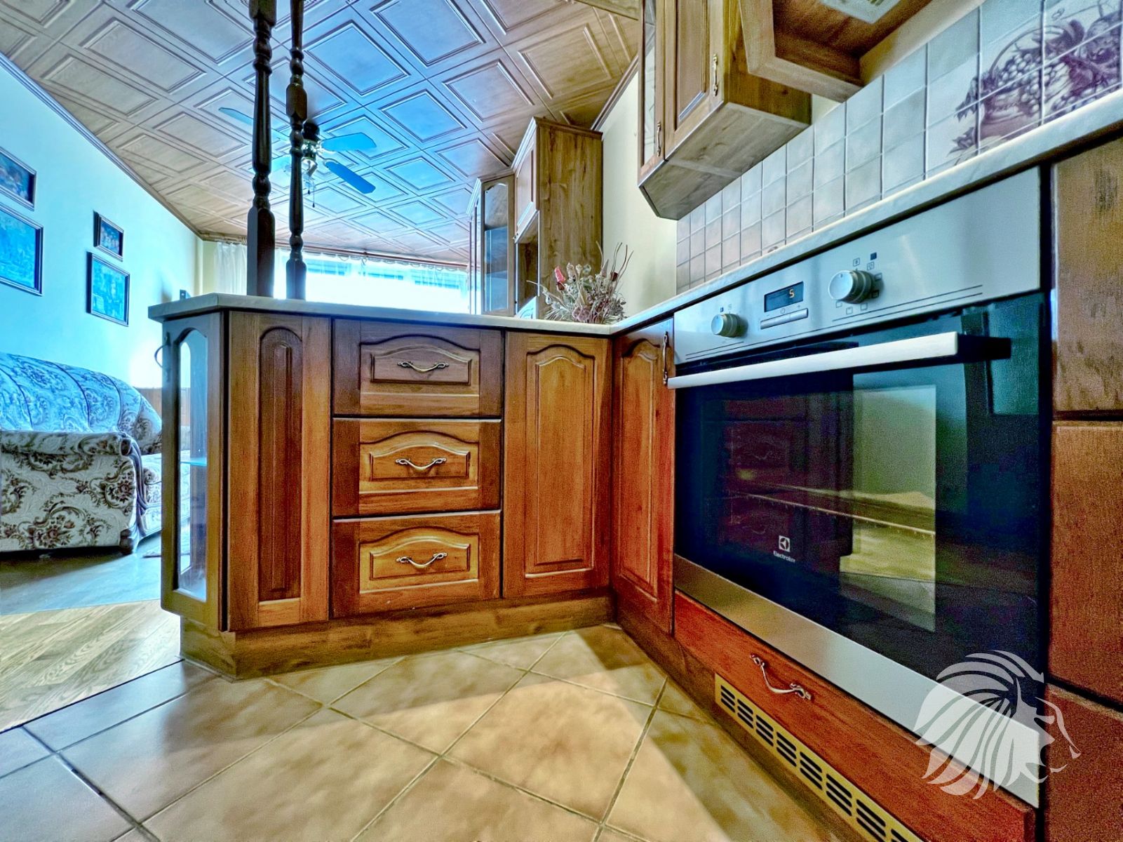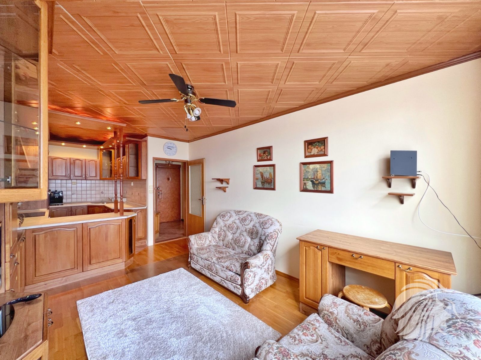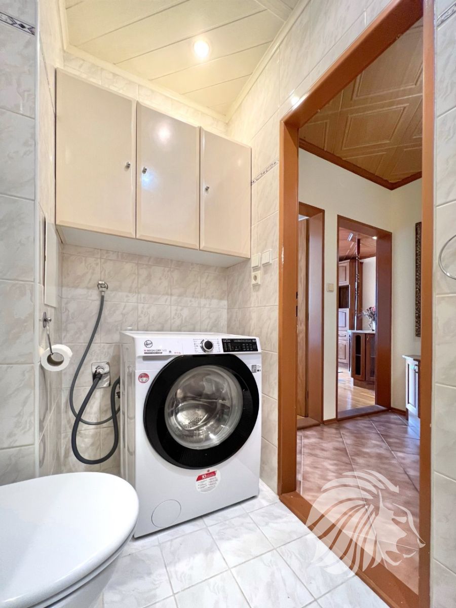Byt je zařízen starším nábytkem v rustikálním stylu. Nábytek poskytuje velké plochy úložného prostoru ve všech místnostech vč. koupelny.