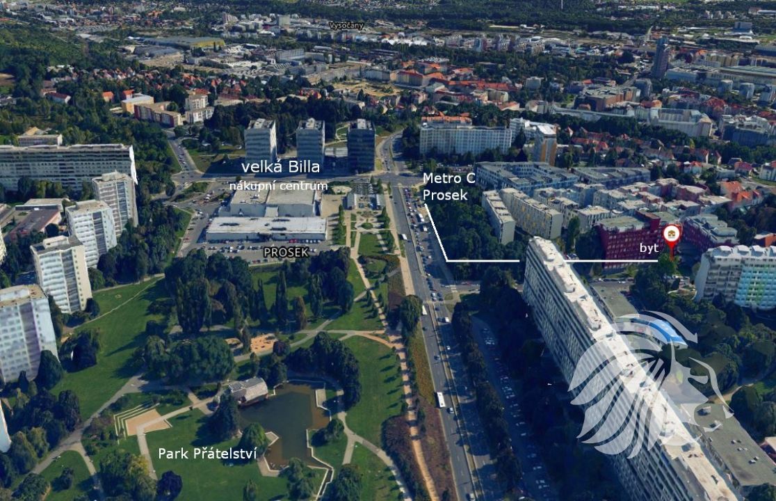 Výhled na jihovýchod do klidné části bytové zástavby, v těsné blízkosti Parku Přátelství a přitom pouhé 3 minuty od metra C Prosek. To je nábytkem zařízená bytová jednotka 2+kk bohatá na úložný prostor.
