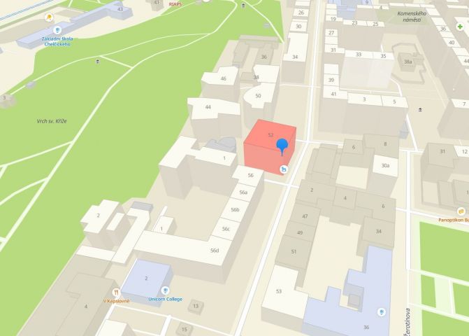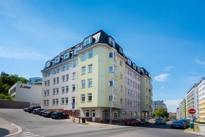 Byt se nachází v horní části Jeseniovy ulice, Praha 3 Žižkov, v 6. nadzemním podlaží (5.patro) bytového domu s orientací na SV. Ložnice směřována na S, rohový obývák na SV, ostatní místnosti směr V. Nad jednotkou se nachází další poslední podlaží, taktéž s byty. 7 podlažní dům o 24 bytových jednotkách a dalších nebytových prostorách stojí v obklopení zeleně: úžasného Vrchu sv. Kříže – Parukářky a Vítkova s dominující sochou Jana Žižky. Atmosféru v bytě vytváří jeho světlost díky rohové orientaci, dech beroucí pohled shora na Kostel sv. Anny, prostorový výhled do Jeseniovy a bočních ulic, atypické prvky v obýváku – vikýřová okna, šikmé stěny, ale také velké vzdušné místnosti.