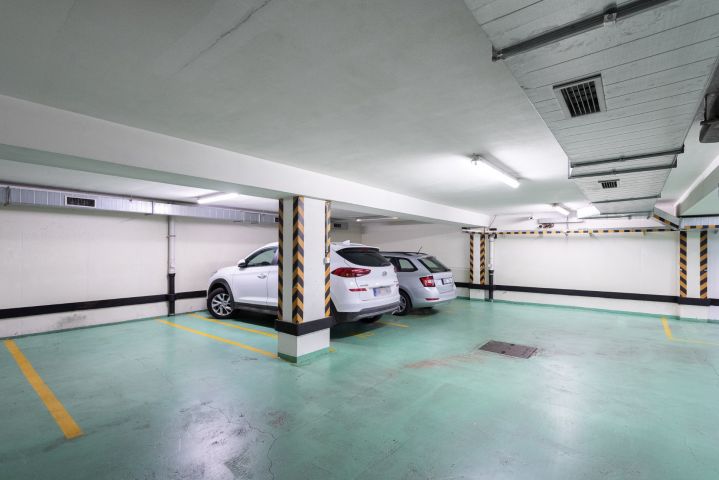 Garážové stání v domě. Jednotka umístěná v 1. PP tvoří prostory pro garážové stání. Užívací právo o podílu 1/25, činí 9,9m² (4,50 × 2,20 m) a leží pár metrů od vnitřního vstupu k výtahům. Pohodlně vjedete přes el. vrata s dálkovým ovládáním ze západní části domu z ulice Ostromečská. Prostory s 25 parkovacími místy jsou opatřeny kamerovým systémem.
