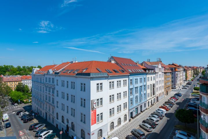 Oblíbenější horní část Žižkova, vyhledávaná díky specifické atmosféře čtvrti, všudypřítomné zeleni, s úžasnými panoramatickými výhledy na celou Prahu a např. dětským hřištěm na Parukářce, vysoce rozvinuté infrastruktuře, venkovním koupalištěm na Pražačce a velkému množství nákupních příležitostí, restaurací a hospůdek. U domu se nachází BUS zastávka „Ostromečská“ s linkami 133,136,207,908,909. Tram. zastávka „Biskupcova“ 5,8,9,11,14,19,25. Dojezdová vzdálenost 12 minut na Florenc metro C a B. Sportovní vyžití a nákupní možnosti jsou v lokalitě nepřeberné. Vinohradská nemocnice je vzdálena 11 min.