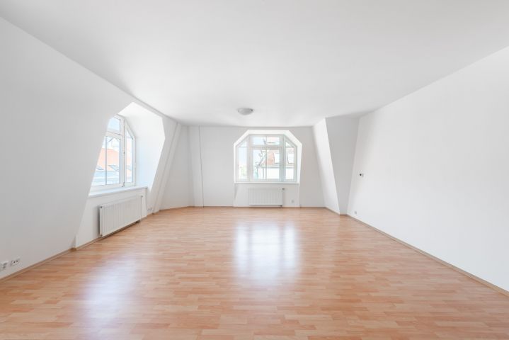 atypickém obývacím pokoji o ploše 45,5 m² s vikýřovými okny si